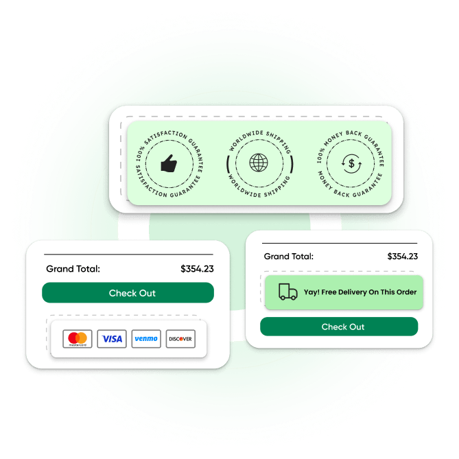Highlight Promotional Message Or Key Commitment— Like ‘’30-Day-Money-Back-Guarantee’’ Or ‘’Free Delivery At Your Doorstep’’ —With a Clear, Bold, And Eye-Catchy Sales Banner. These Attention-Grabbing Single Banners Are Ideal For Placing Below The Product Description Or Near The Checkout Button to Immediately Assure The Buyer And Build Trust At The First Impression.